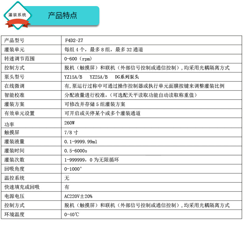 此灌裝系統由4通道組成,通道數量可定制,大可擴展至32通道;可安裝YZ15、YZ25泵頭、DG泵頭;