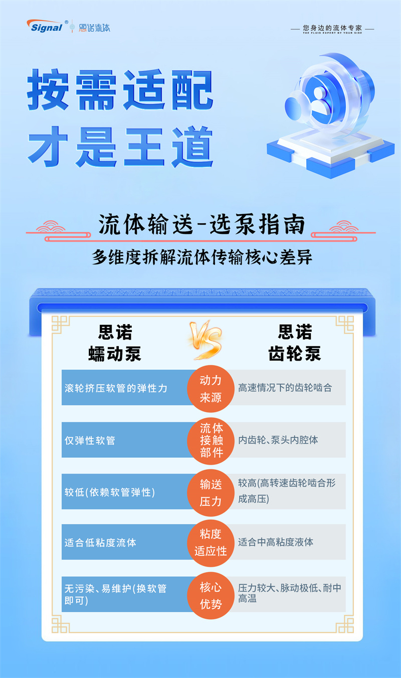 按需適配,方為選型王道。蠕動泵和齒輪泵各有千秋。蠕動泵輸送溫和、無污染、易清潔且能處理含固體顆粒流體,尤其適合衛生、腐蝕性或剪切敏感介質。齒輪泵則結構緊湊、輸出壓力高、流量穩定且效率高,適合高粘度流體和高壓需求。兩者并無絕對優劣,關鍵在于根據具體應用需求(如介質特性、壓力、流量、衛生等級、預算)進行精準適配。